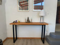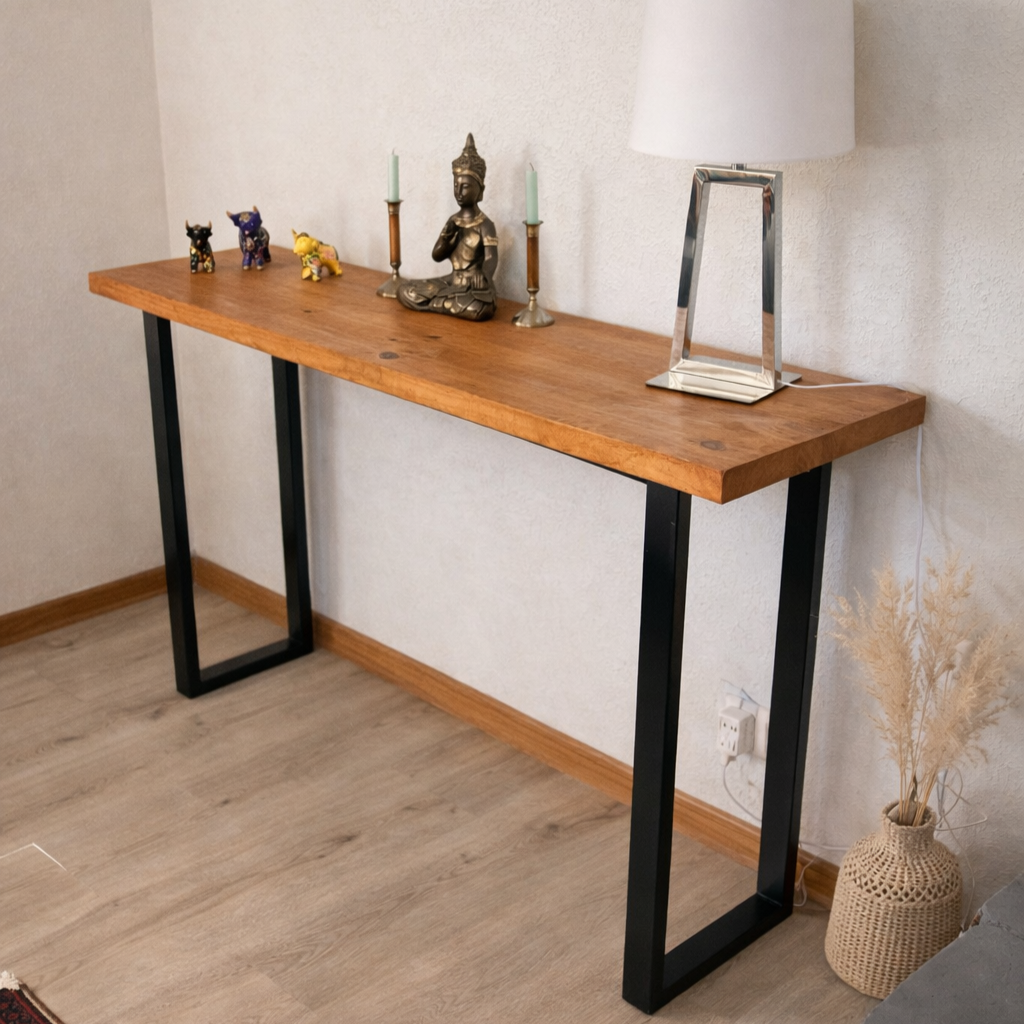 Su cubierta de roble macizo de 4 cm aporta una textura natural y robusta, mientras que su base "Corchete" (fabricada en perfil de fierro de 50x30 mm) le da ese toque industrial moderno y ligero que no satura el espacio.