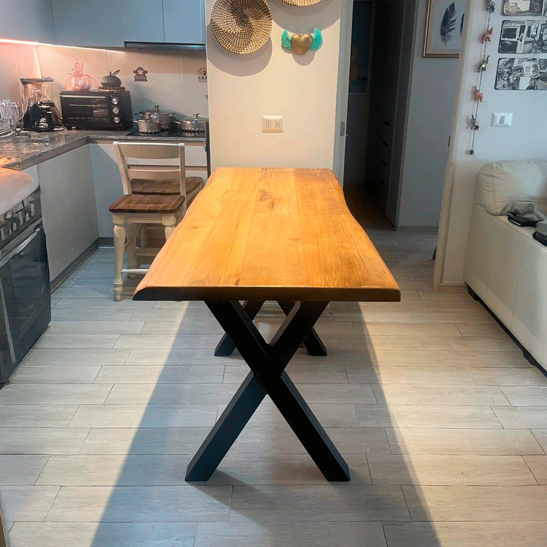 Para soportar esta altura con total seguridad, utilizamos una Base en X de perfil grueso (75x75 mm). Esto garantiza que, aunque sea alta, la mesa sea inamovible.