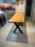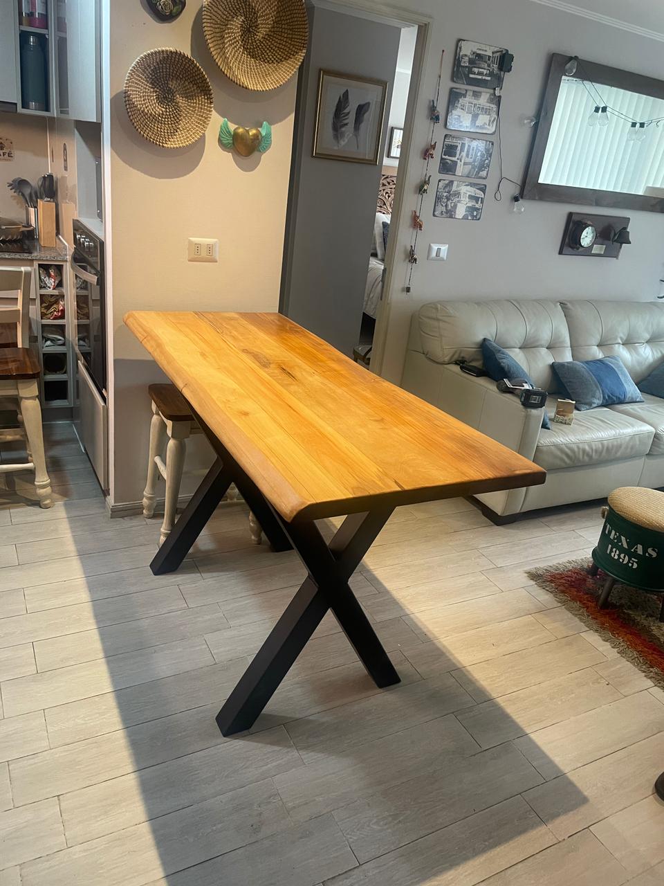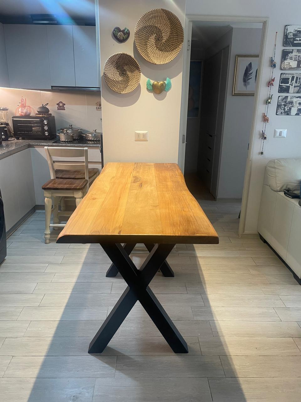 La base en forma de “X” está construida con perfil de fierro de alta resistencia (75x75 mm, espesor 2 mm). Su acabado con pintura antioxidante, disponible en color negro o blanco, crea un contraste elegante con la calidez del roble y garantiza durabilidad frente al uso constante.