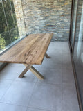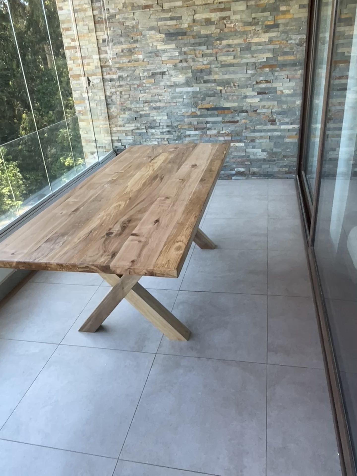 Fabricada 100% en roble noble, su cubierta de 4 cm flota sobre una estructura que permite que la luz y el aire circulen. Es robusta, sí, pero visualmente ligera.