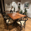 Fabricada con un perfil de fierro de 75x75 mm, esta base soporta con elegancia la cubierta de roble macizo de 4 cm. Al concentrar la estructura hacia el centro, permite sentarse cómodamente en las esquinas y maximiza el espacio para las sillas.